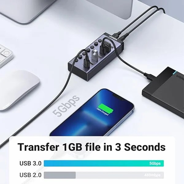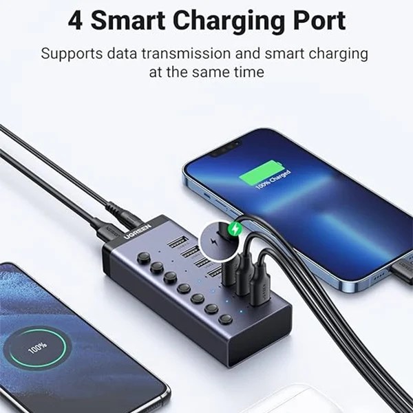 - 4 Port Smart charging: Powered usb hub support data transfer and charging phone, small electric fan and more. The most important thing is that it could automatically detect your device’s charging protocols to deliver the optimum charge .UGREEN Powered usb hub 3.0 switch provide a safe charging solution to protect your devices